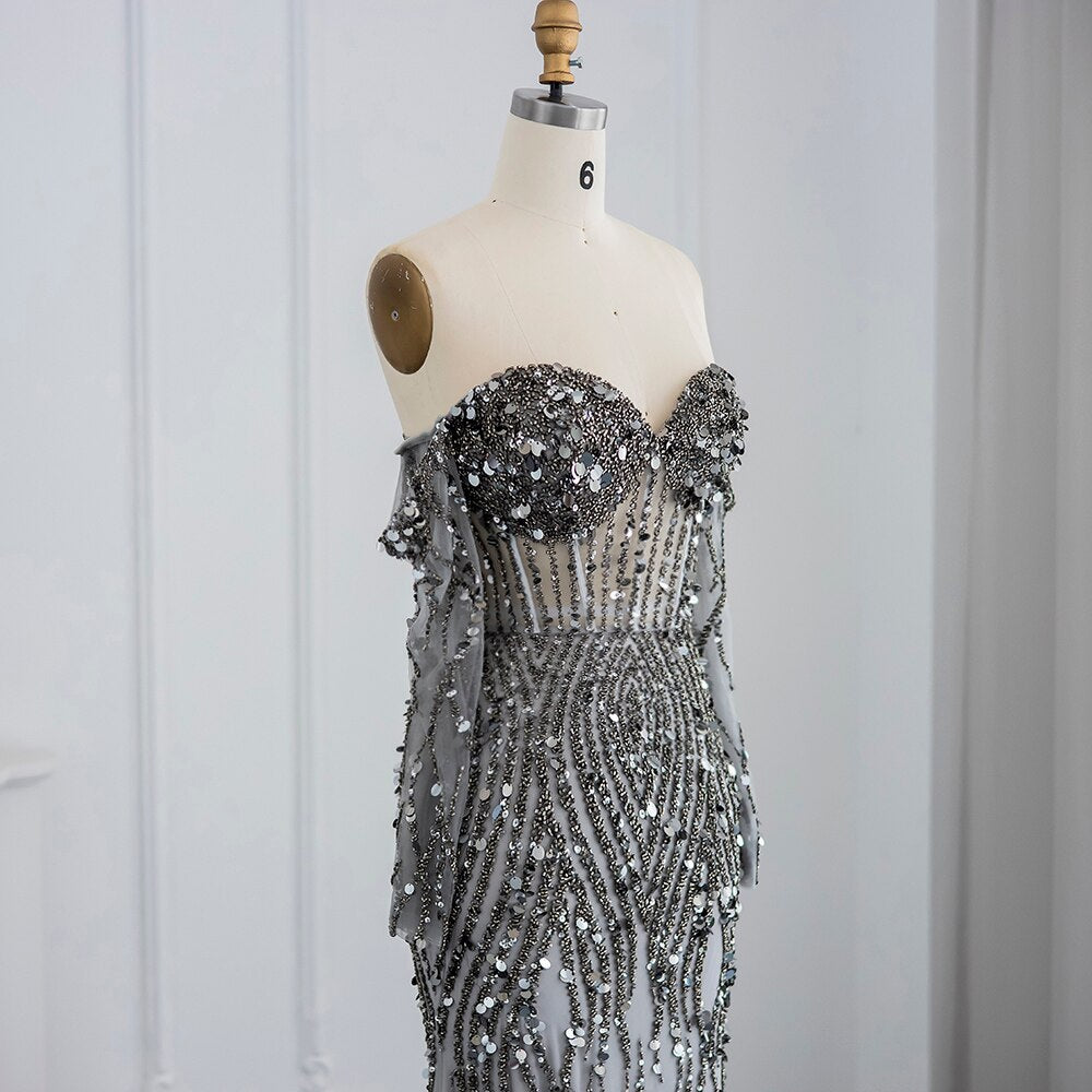Abito da Sera di Lusso Grigio Sirena Dubai: Elegante con Spalle Scoperte e Dettagli Oro per Prom e Matrimoni - Abiti Formale per Donne