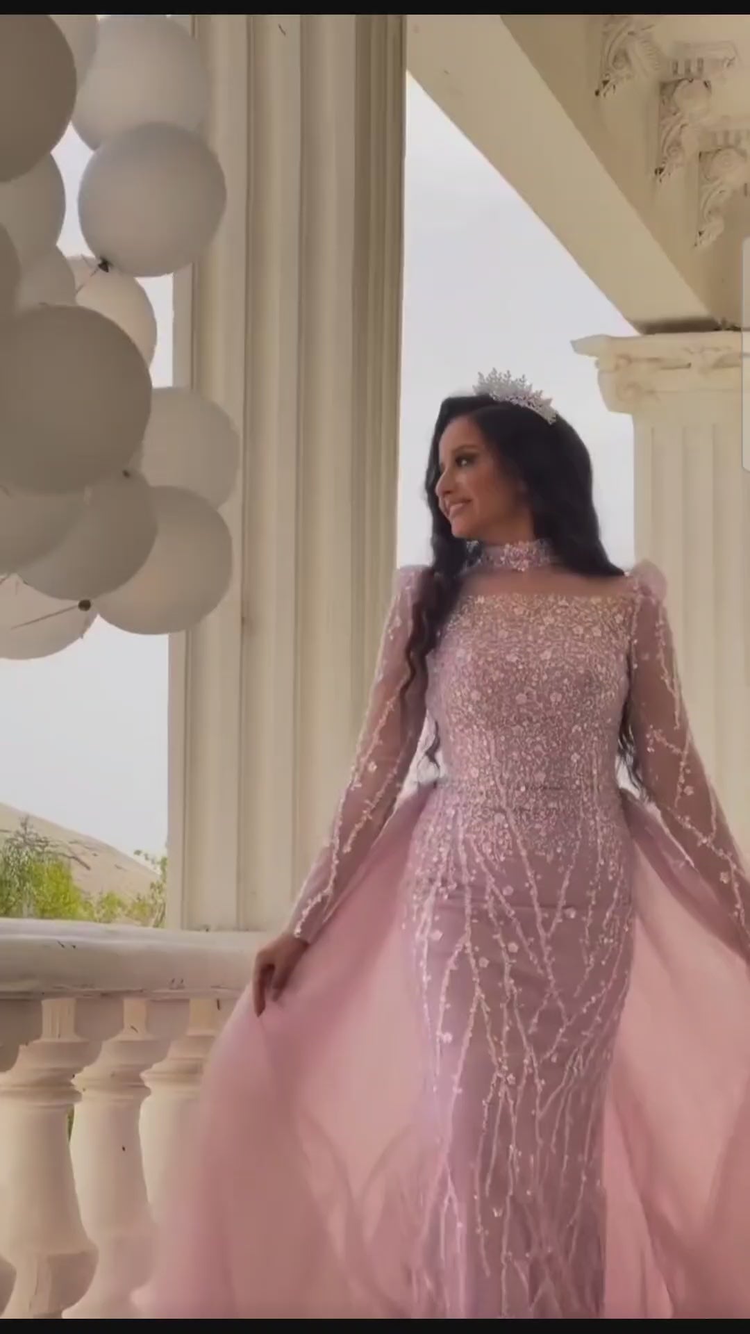 Eleganti abiti da sera a sirena rosa per le donne 2023 maniche lunghe collo alto perline paillettes abiti da cerimonia da ballo da donna moderna