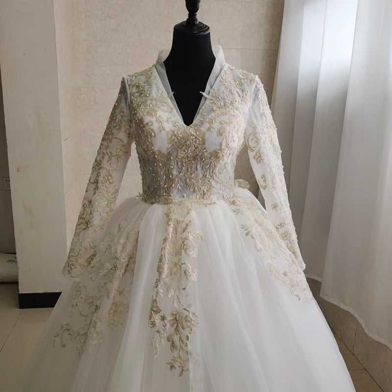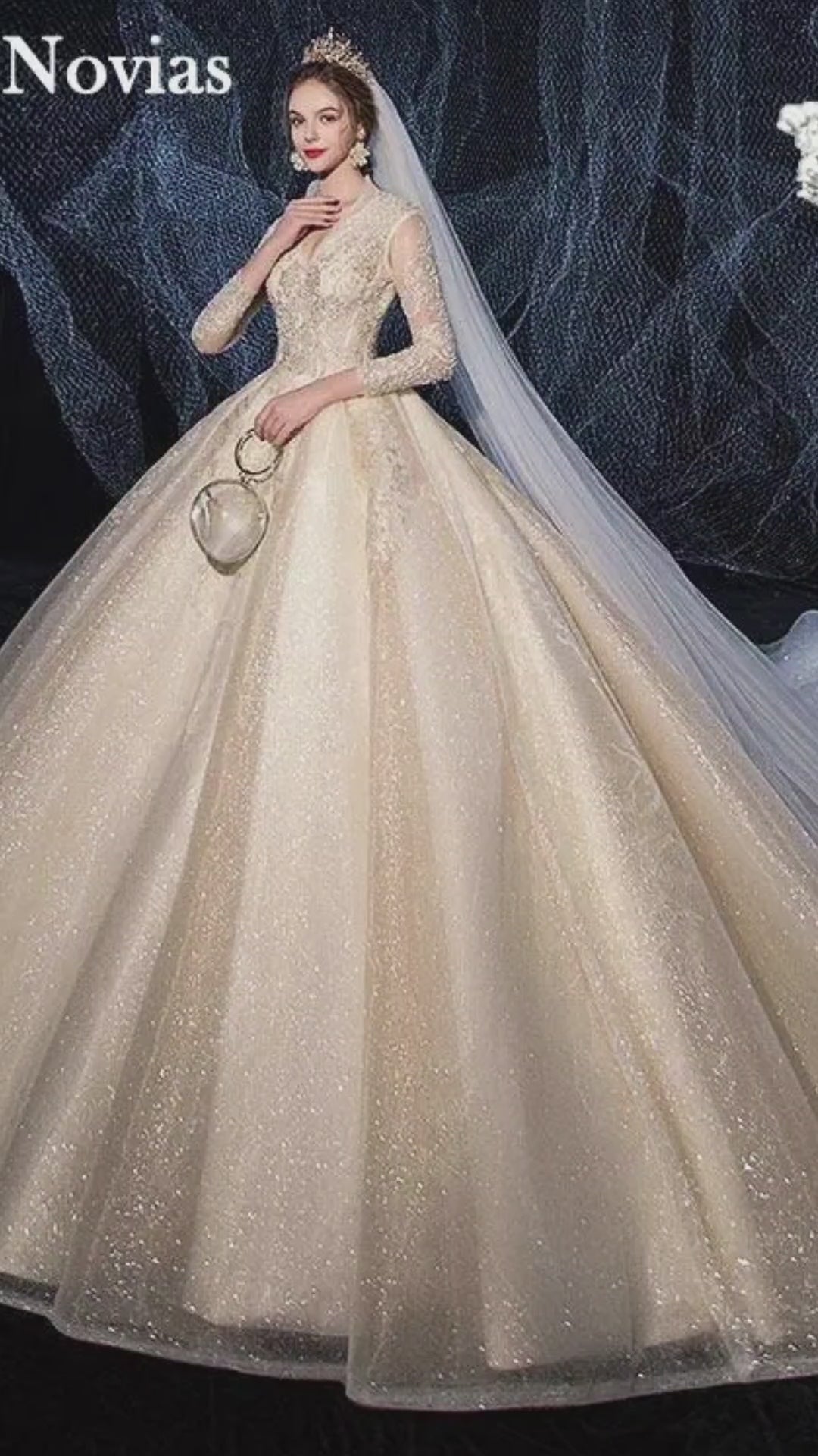 Preparati a incantare nel giorno più speciale con questo meraviglioso abito da sposa in pizzo con scollo a V profondo. La sua gonna a balze e lo strascico reale aggiungono un tocco regale al tuo look da sposa. Le maniche lunghe ne completano l'aspetto, donandoti eleganza e stile. Realizzato con cura e attenzione ai dettagli, questo abito da sposa unico cattura l'essenza della femminilità e della grazia. La tonalità Champagne Avorio si adatta perfettamente a un matrimonio indiano, mentre il bouquet aggiunge un tocco di colore e raffinatezza. Scegli questo abito da sposa per sentirti una principessa nel giorno del tuo matrimonio
