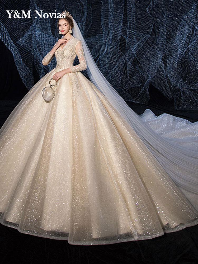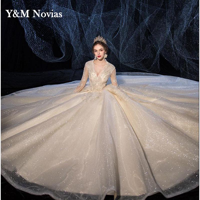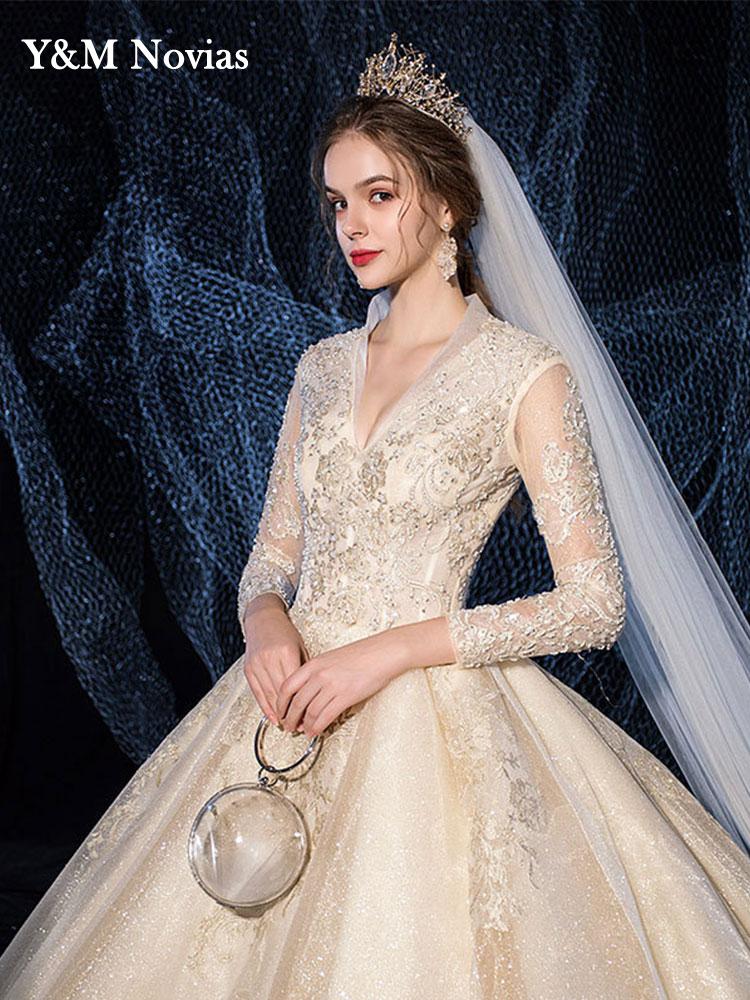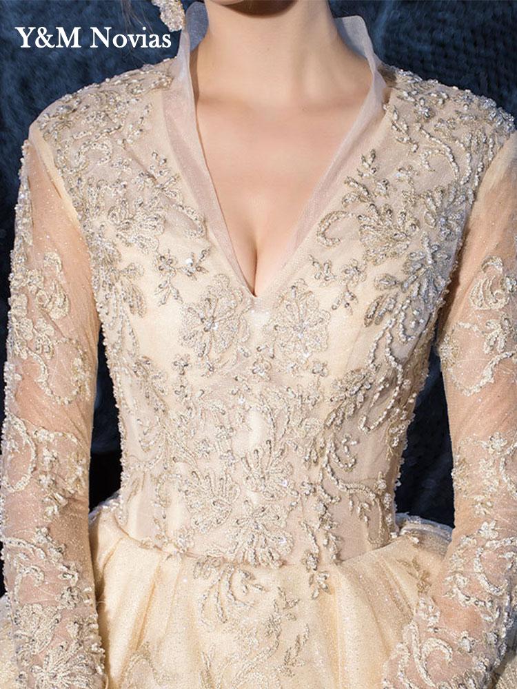 Abito da sposa in pizzo con scollo a V profondo, gonna a balze, strascico reale e maniche lunghe - Donna Indiana - Champagne Avorio - Bouque