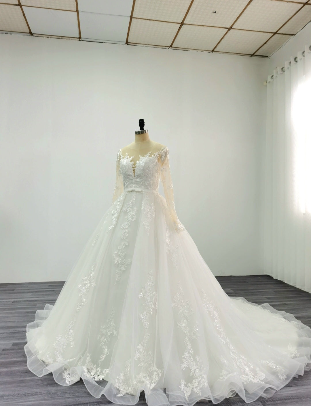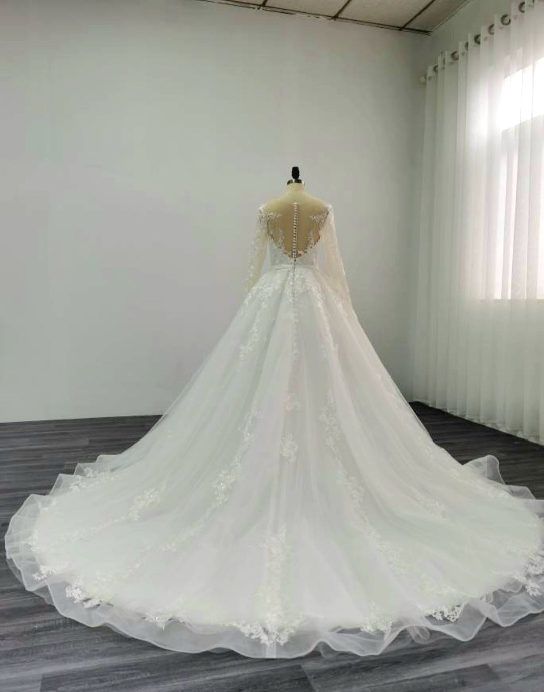 Questo abito da sposa Fmogl Elegant Illusion è un'opera d'arte, perfetto per le spose che cercano un look vintage e raffinato. Le maniche lunghe trasparenti e il collo a barca con applicazioni floreali aggiungono un tocco romantico al vestito, mentre la gonna a trapezio con una coda lunga aggiunge eleganza e sofisticazione. Questo abito da sposa è perfetto per qualsiasi sposa che vuole essere indimenticabile nel giorno più importante della sua vita.