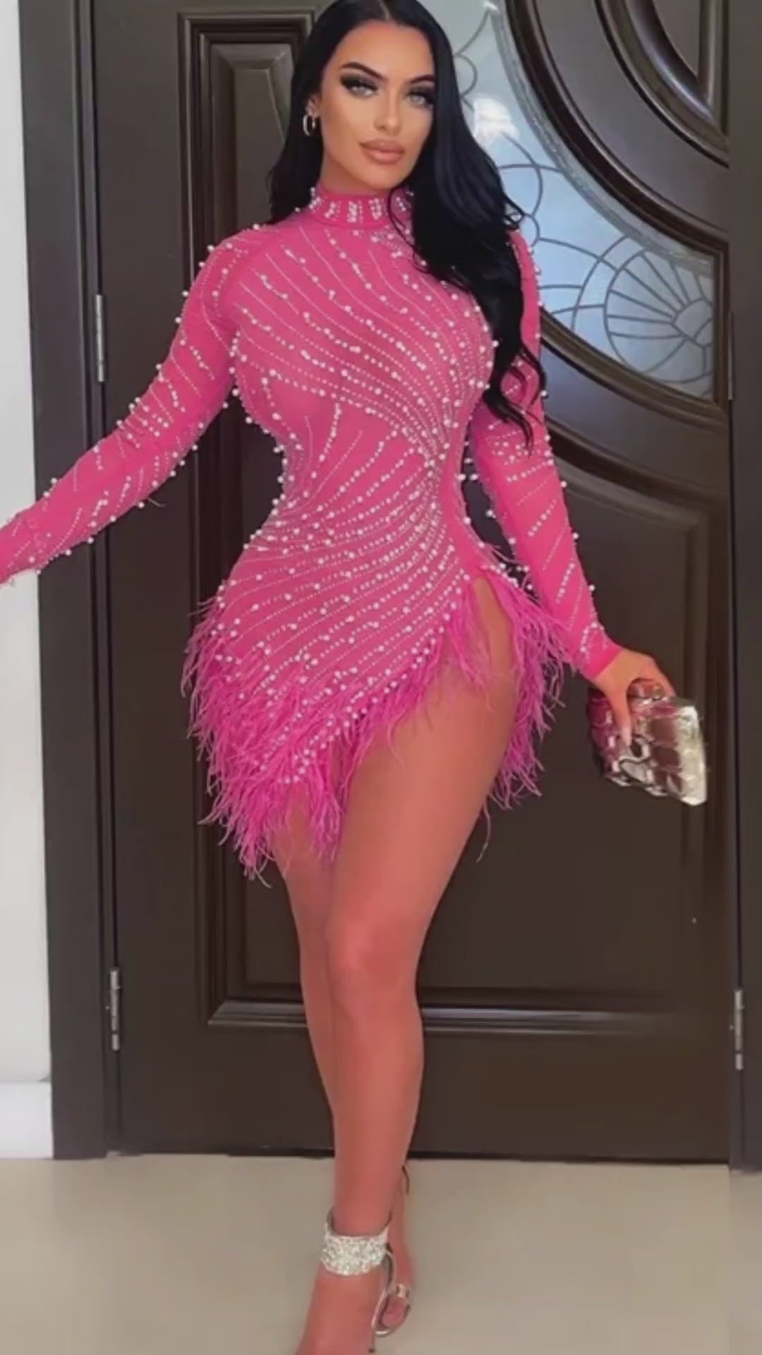 Mini abito di lusso con strass e perle di piume nuove donne primaverili abiti da festa corti con paillettes a rete trasparente abiti di compleanno