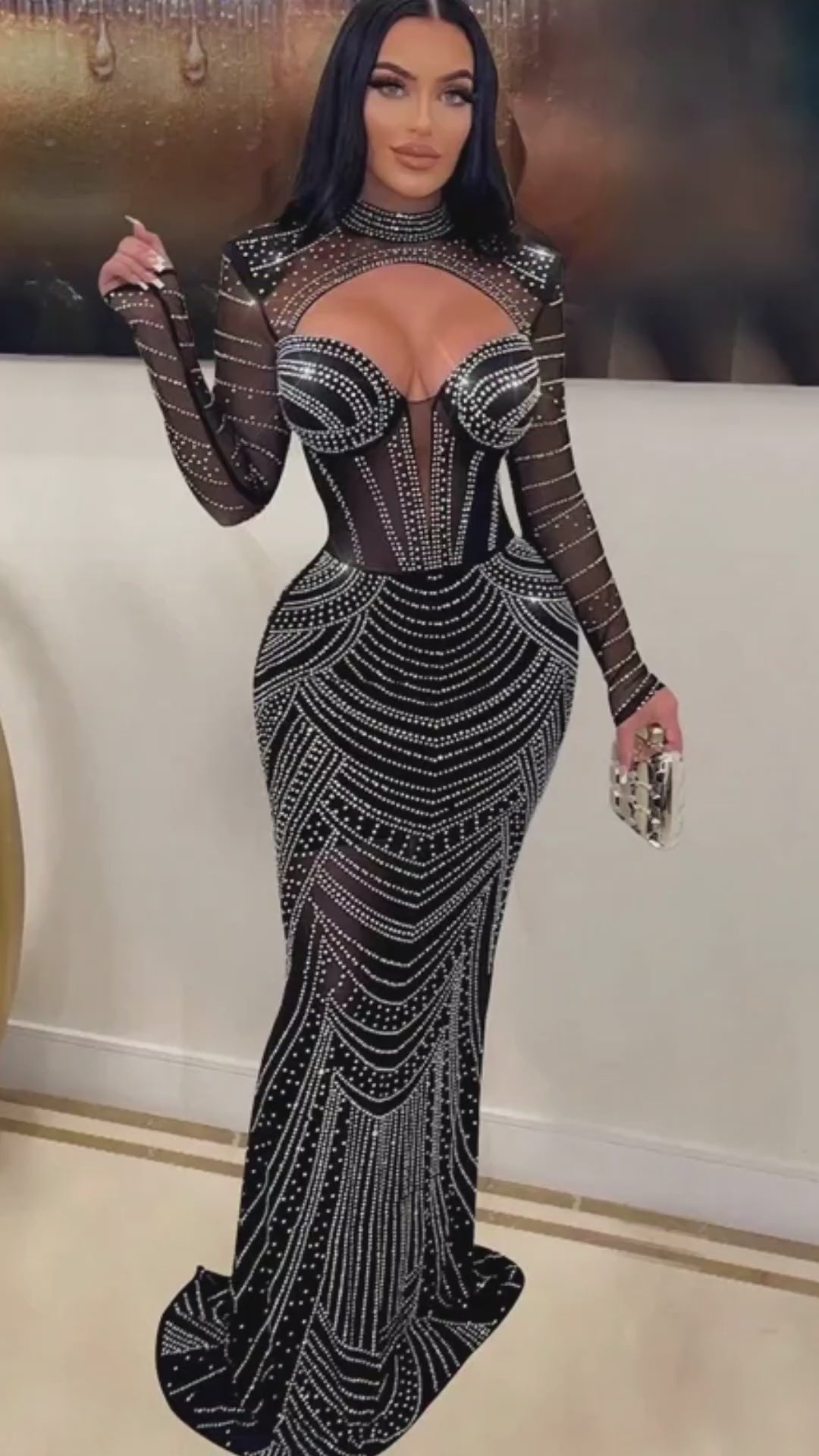 Abito lungo trasparente con strass in maglia di cristallo con strass sexy. Abito lungo da indossare in discoteca con maniche lunghe da donna
