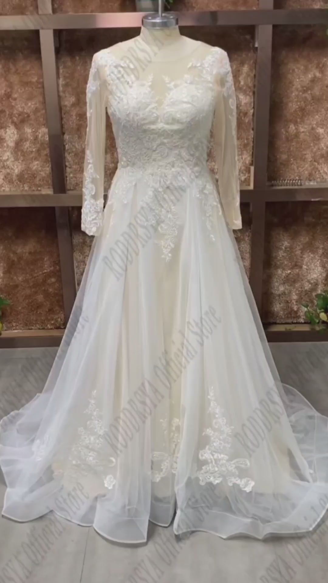 Abito da sposa di lusso con maniche lunghe in pizzo, applicazioni in tulle trasparente, schiena scoperta e gonna a-linea