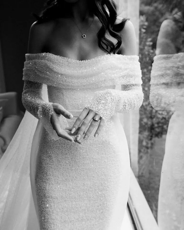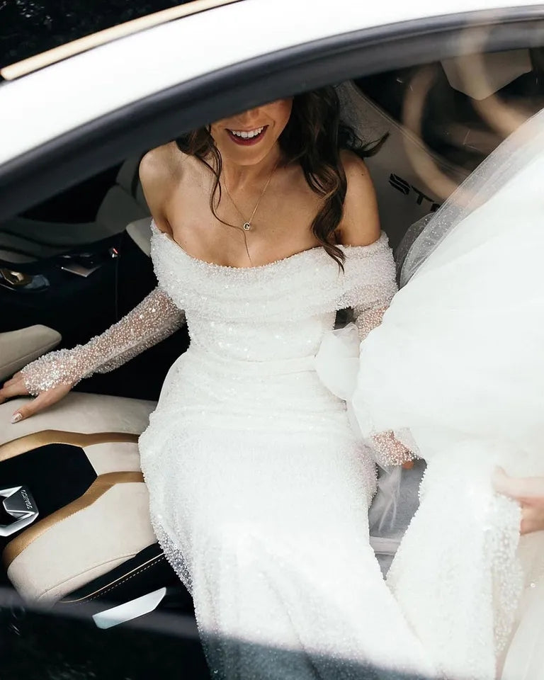 Abiti da sposa aderenti in Boemia con maniche lunghe lucide senza spalline eleganti a sirena senza spalline