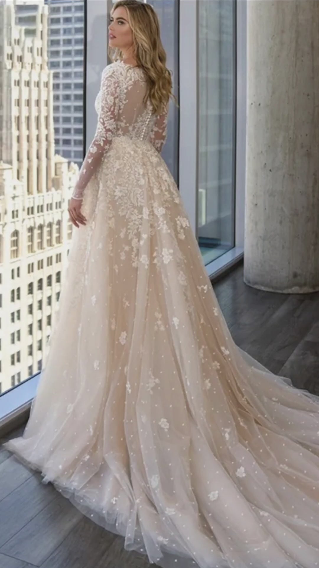 Abito da Sposa di lusso con coda staccabile e applicazioni di pizzo a forma di sirena, scollatura a V con maniche lunghe.
