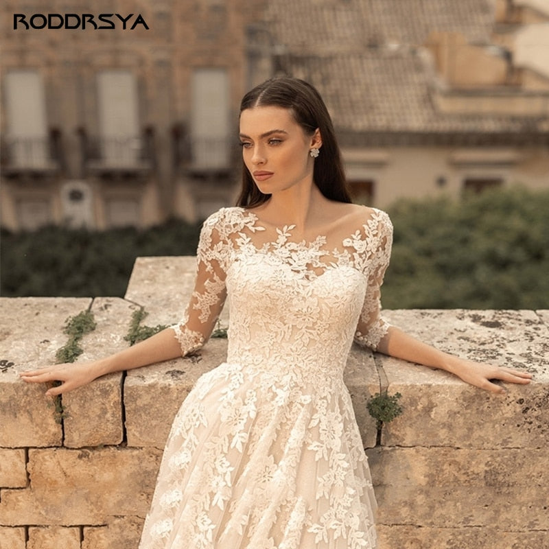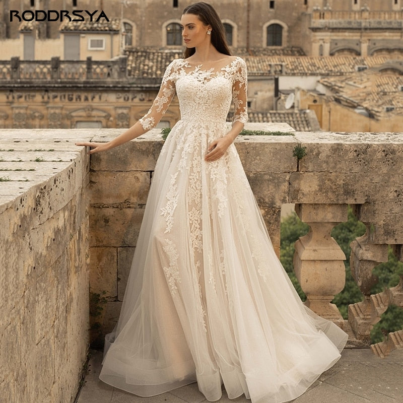 Abito da Sposa Vintage con Scollo Trasparente e Maniche in Pizzo 3/4 - Vestidos De Noiva Boho con Tulle e Applicazioni, Strascico, Stile Incantevole