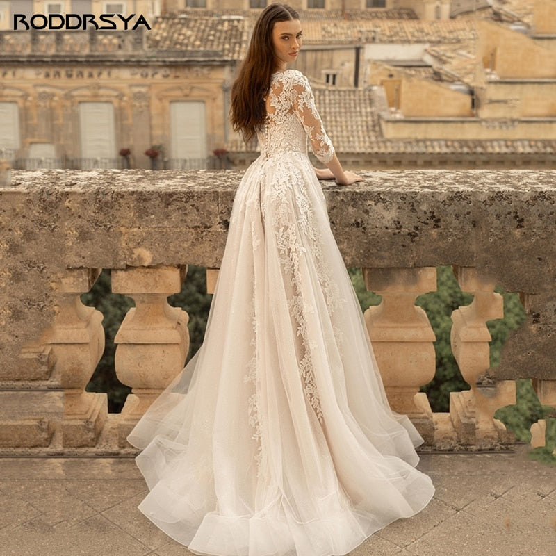 Rivivi l'eleganza senza tempo con il nostro abito da sposa vintage con scollo trasparente e delicate maniche in pizzo 3/4. Questo meraviglioso abito Vestidos De Noiva incarna lo spirito boho con il suo tulle leggero e dettagli di applicazioni artistiche. Lo strascico aggiunge un tocco di romanticismo, mentre lo stile incantevole cattura l'essenza delle nozze boho. Indossa questo abito e lascia che la tua giornata speciale risplenda con autentica bellezza vintage.