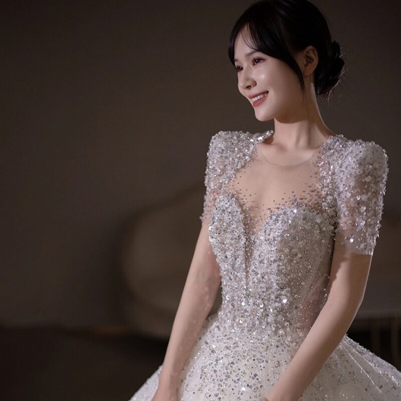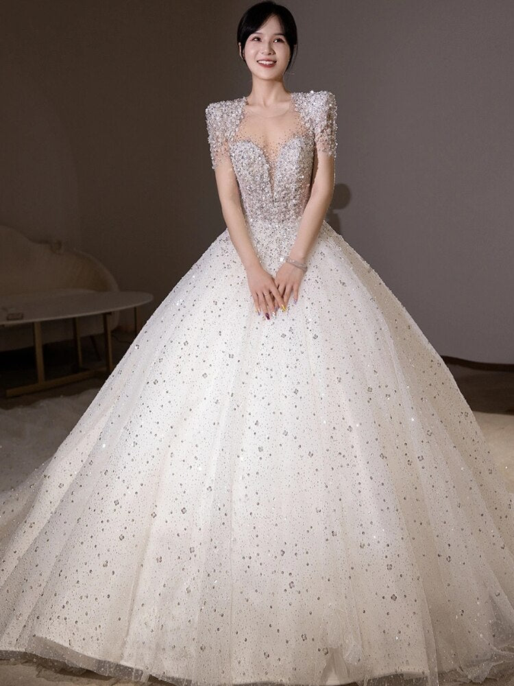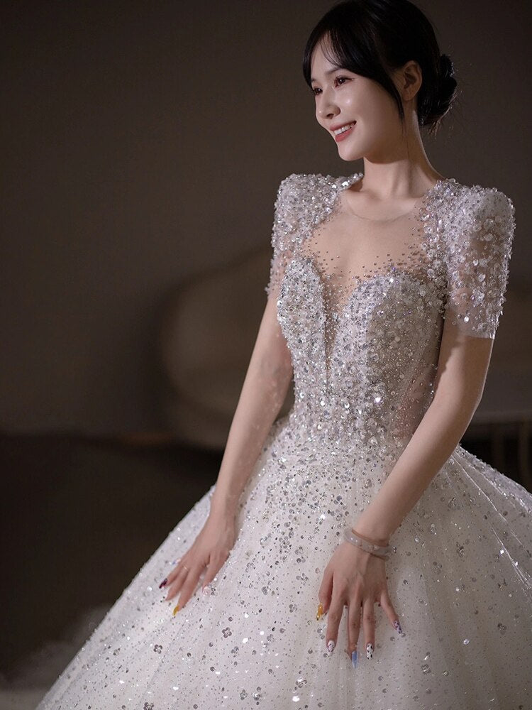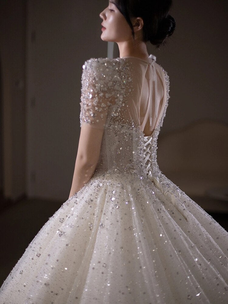 Abito da Sposa Corto con Maniche Corte e Dettagli Luminosi di Paillettes e Perline - Eleganza, Lusso e Stile Unico per il Tuo Giorno Speciale